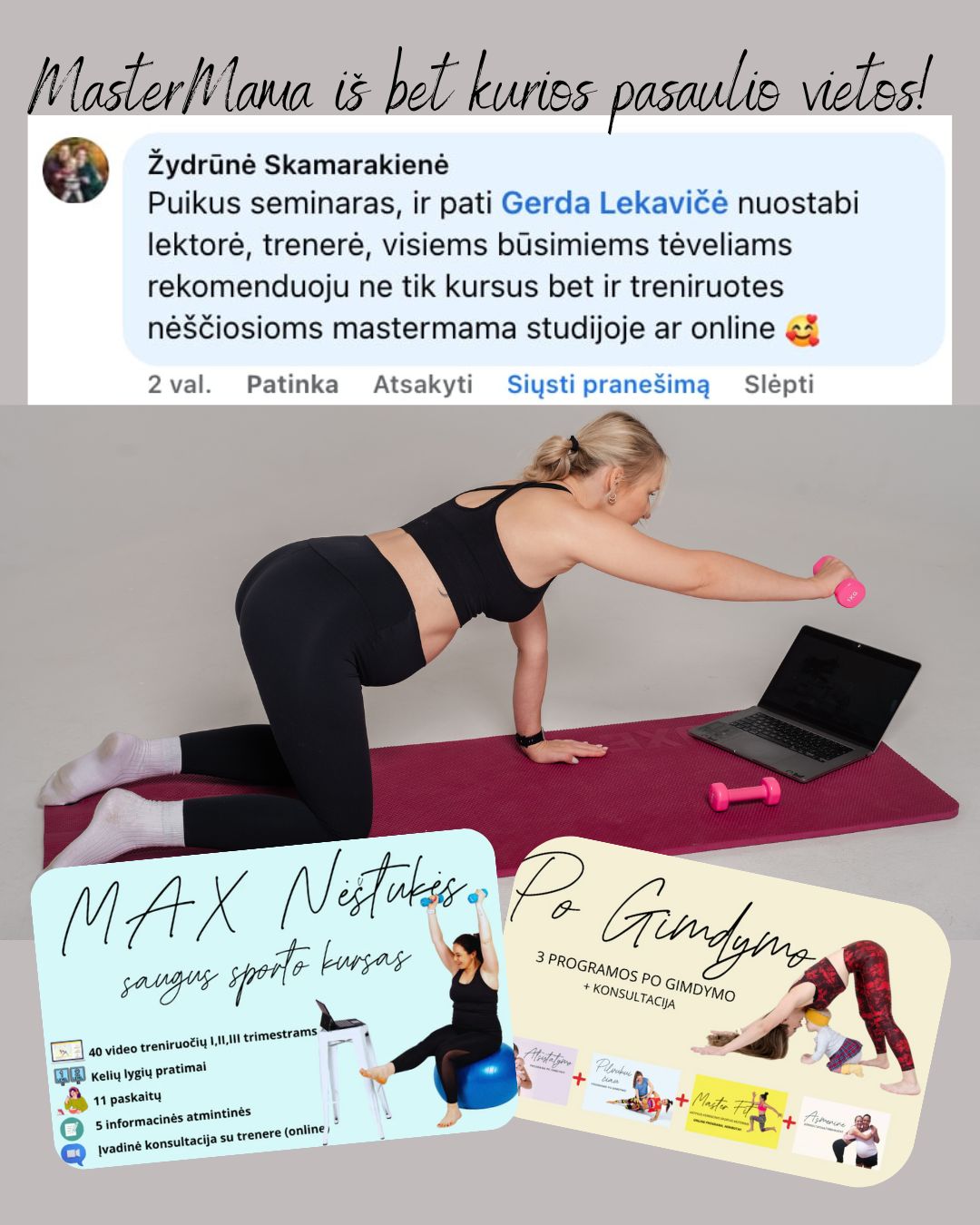 Susitikimai online su trenere per zoom platforma. Stebi jūsų laikyseną, atsako į klausimus, padeda sekti online kurso gaires ruošiantis gimdymui. Įeina MAX kursas, kuriame rasite treniruočių įrašus specializuotos korekcinės,